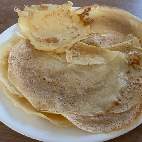 - A cottura ultimata, far scivolare la crêpe in un piatto da portata. Proseguire con il resto dell’impasto, impilando le crêpes una sull’altra. Farcire a piacere e servire subito.